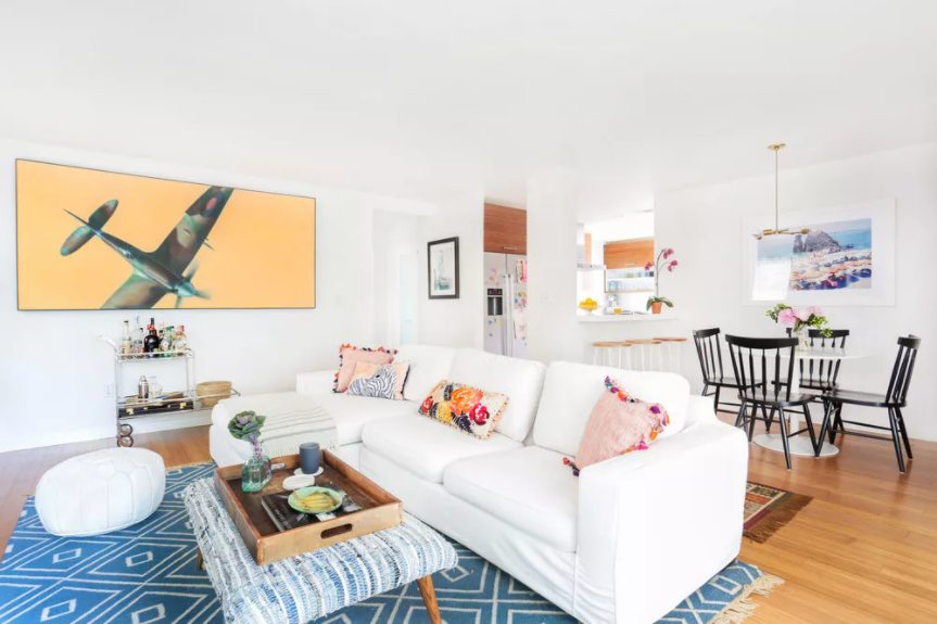 밝고 통풍이 잘되는 것은 대부분의 사람들이 현대적인 장식을 생각할 때 떠오르는 두 단어입니다. 여기에서 팝 컬러는 대부분 중성 톤의 방을 활기차게 만듭니다. 벽에 걸린 큰 글씨는 생동감을 높여줍니다.
