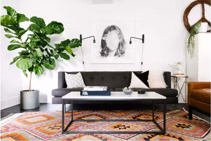 여기 보헤미안에서 영감을받은 공간의 핵심은 흑백의 추상적 인 자화상입니다. 장식하는 모든 방에서 색상과 질감의 균형을 맞추는 것은 필수적입니다. 화분에 심은 바이올린 잎 무화과 나무가 숯 소파를 부드럽게 만드는 방법에 주목하십시오. 그런 다음 기하학적 깔개와 가죽 사이드 의자가 있습니다. 둘 다 산업에서 영감을 얻은 커피 테이블과 구리 사이드 테이블의 균형을 맞추는 실내 온난화 요소입니다.