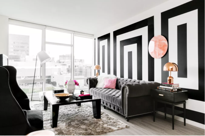 대부분 단색의 현대적인 거실은 흑백 기하학적 벽 덕분에, 메탈릭 액센트는 항상 완전히 현대적입니다. 여기에 순간의 금속 인 구리가 고급 스러움을 더합니다.