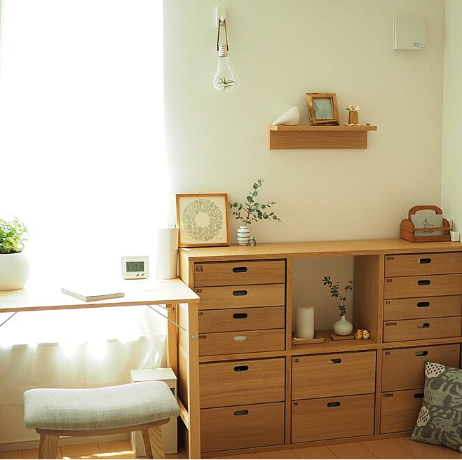 침실의 선반과 책상은 무인 양품에서 일관성있는 공간. PC 용으로 주로 활용되고 있습니다.