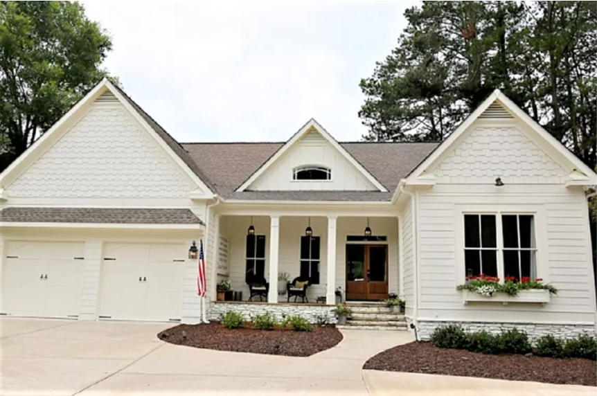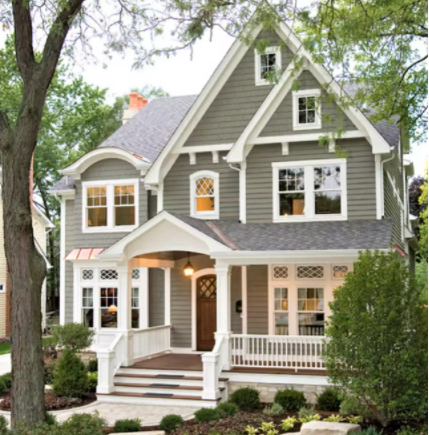 6. 이 주택의 넓은 흰색 트림의 경우 필드 색상의 회색을 현명하게 음영 처리하여 흰색 트림과의 차이를 강조했습니다.