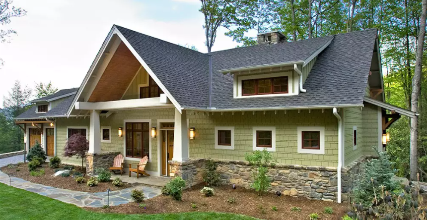 5. 숲 속에 화려하고 넓게 펼쳐진 장인 스타일의 집이있는 경우 주변 환경과 어울리는 외부 페인트 색상을 원할 것입니다. 녹색은 무성한 주변 나무뿐만 아니라 제조 된 석재 베니어 앞치마 및 선명한 흰색 트림과 완벽하게 조화를 이룹니다.