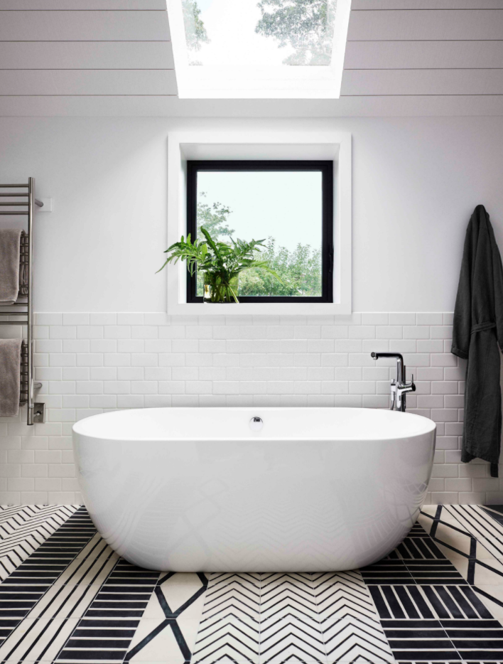 바닥의 기하학적인 흑백 패턴은 이 단순한 욕실에 적절한 감각을 더합니다.