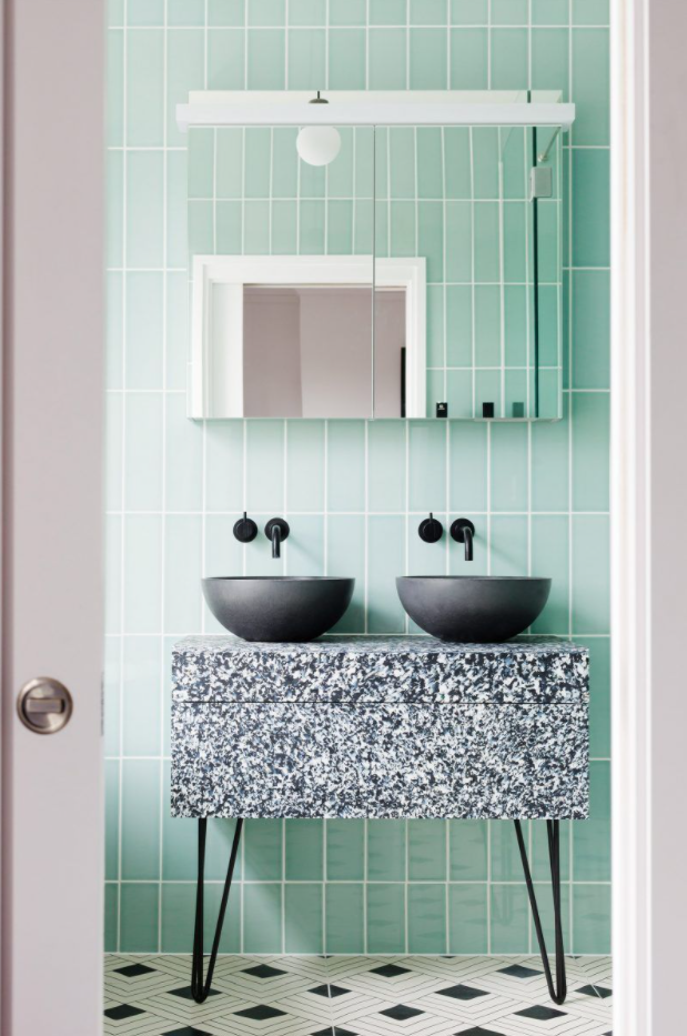바닥의 기하학적인 흑백 패턴은 이 단순한 욕실에 적절한 감각을 더합니다.