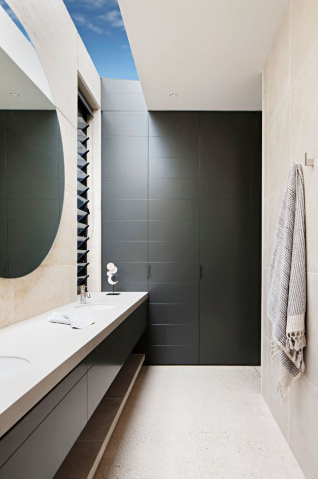 좁은 욕실을 대형 거울 원형 거울과 채광창으로 넓게 만들어 방 전체를 밝게했습니다. 자연광이 많지 않다면 반 사면과 대형 화장 거울은 적어도 약간 햇볕이 잘 드는 느낌을줍니다.