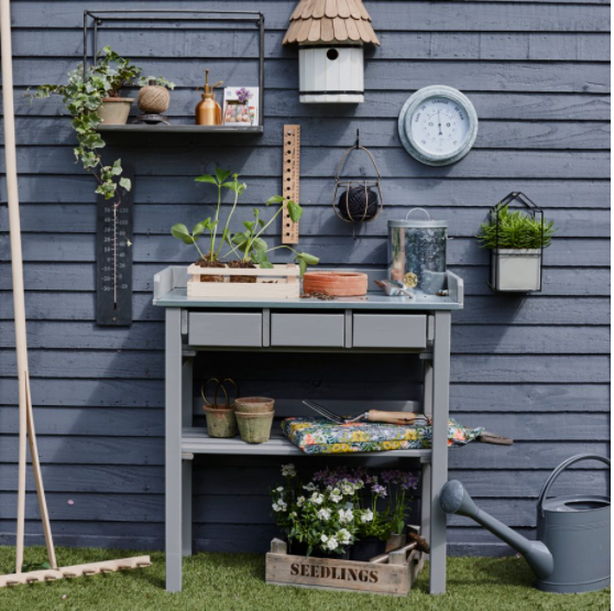 수평 울타리 패널을 간단히 추가하면 창고의 측면이 장식적인 거실 벽으로 바뀝니다. 이것은 또한 노출 된 울타리나 벽 또는 발코니 측면에서 작동 할 수 있습니다. 이러한 야외 공간은 작은 화분과 바구니를위한 수직 정원으로 전환 할 수 있습니다.