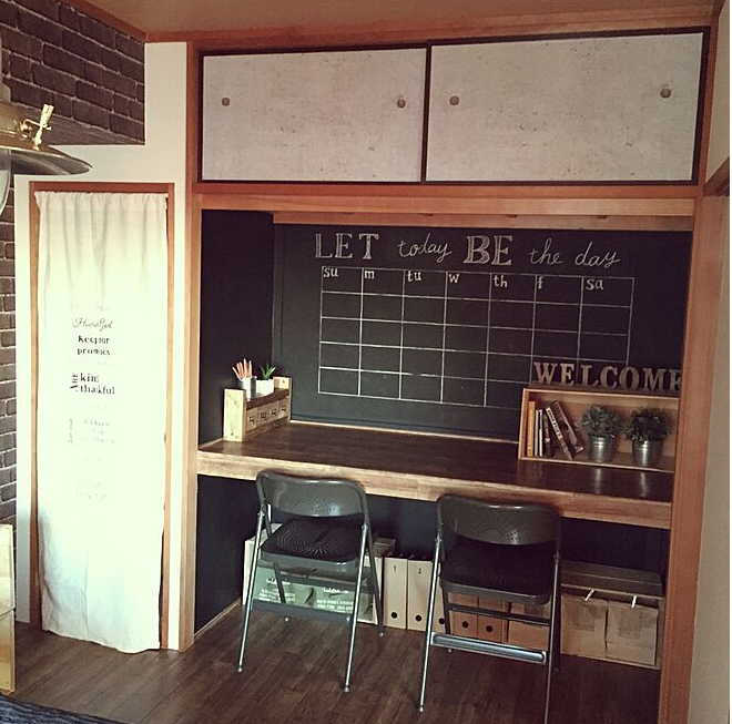 벽장 이용하여 작업 공간 확보. 뒷면 벽은 칠판 페인트로 벽에 메모도 가능합니다.