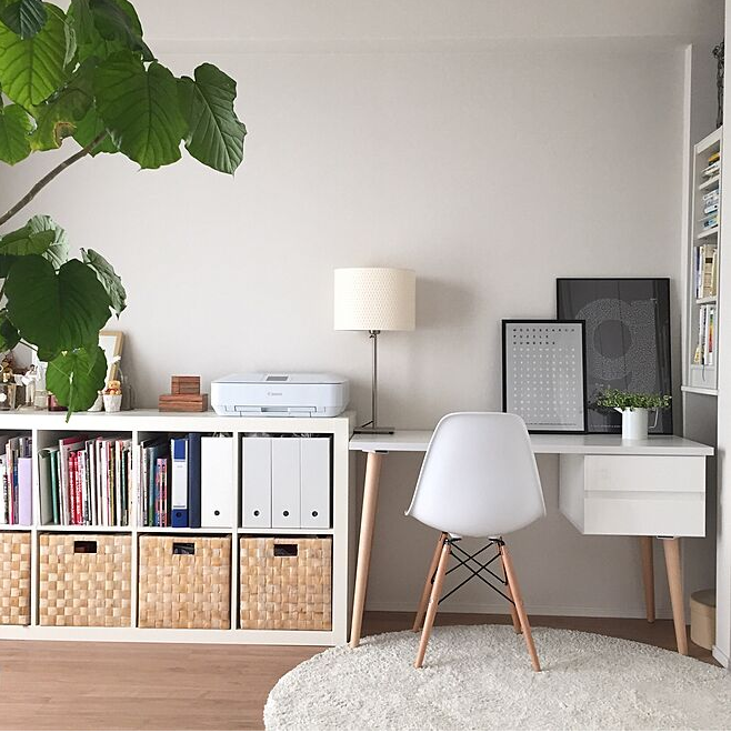 선반과 책상, 의자를 흰색으로 통일하고 정리 된 공간. 러그로 작업 공간이 구획되어 있습니다.