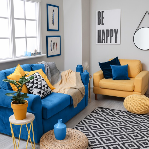 색상은 확실히 여기에 있습니다. 빨강, 파랑 및 녹색과 같은 대담한 색조가 거실을 차지할 뿐만 아니라 줄무늬 및 체크와 같은 패브릭의 밝은 패턴으로 돌아가는 것을 볼 수 있습니다.