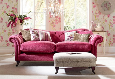 7. 꽃과 꽃 무늬 벽지가있는 선홍색 핑크 소파